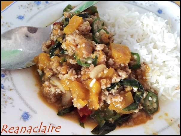 My neighbour gave me half pumpkin and I have been keeping it for a couple of days before I finally decide what to do with it. I cook it into small chunks and sauteed it with minced meat, okra and basil leaves. Yes, it would be great to put in some small cilipadi but unfortunately, I did not find any in my fridge. Steamed a bowl of rice and that was meal for dinner....